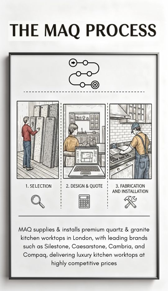 MAQ supplies and installs premium quartz and granite kitchen worktops in London, working with leading brands such as Silestone, Caesarstone, Cambria, and Compaq, delivering luxury kitchen worktops at highly competitive prices.
